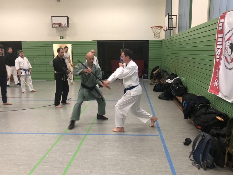 Es war wieder soweit: Lange geplant und gern gesehen - Frank Pelny ! 7.DAN Karate, 6.DAN Ryûkyû Kobudô - sein hervorragendes internationales Renommee hat er auch in diesem Lehrgang wieder eindruckvoll gezeigt. Sportler(innen) aus fünf Vereinen waren angereist. Für jeden war es augenscheinlich, wie excellent er die Techniken beherrscht. Am faszinierendsten war jedoch die Art und Weise wie er Kampfkunst lehrt. Und so haben alle, egal ob neu in den Kampfsport gestartet oder langjährig erfahren, viel Anregendes mitgenommen. Wir freuen uns auf das nächste Mal !